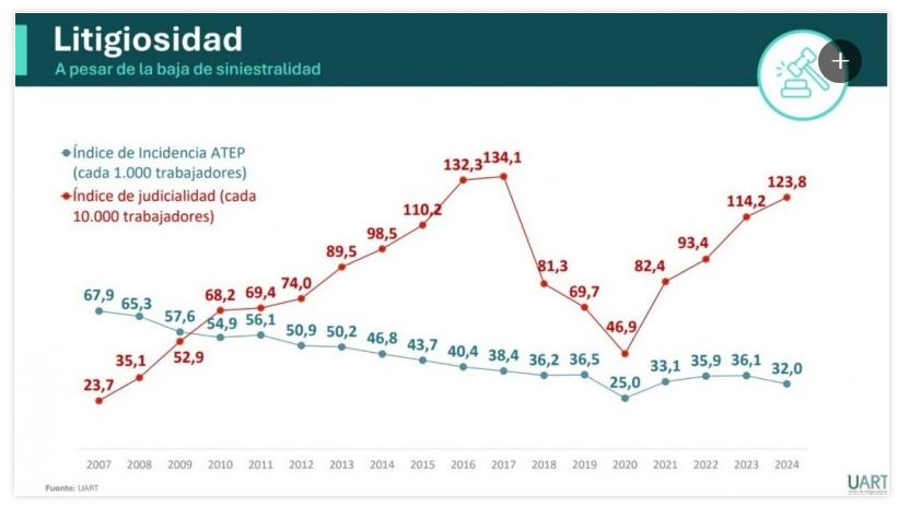 Argentina registra uno de los índices más altos de litigios por riesgos del trabajo, con una tasa de judicialidad que es 15 veces la de España y 21 veces la de Chile, a pesar de tener mayores prestaciones y una accidentabilidad similar. "Es paradójico que, mientras los fallecimientos en el trabajo se redujeron 80% y los accidentes un 55%, la litigiosidad crece exponencialmente, proyectándose más de 130 mil juicios en 2025", dicen en la cámara.