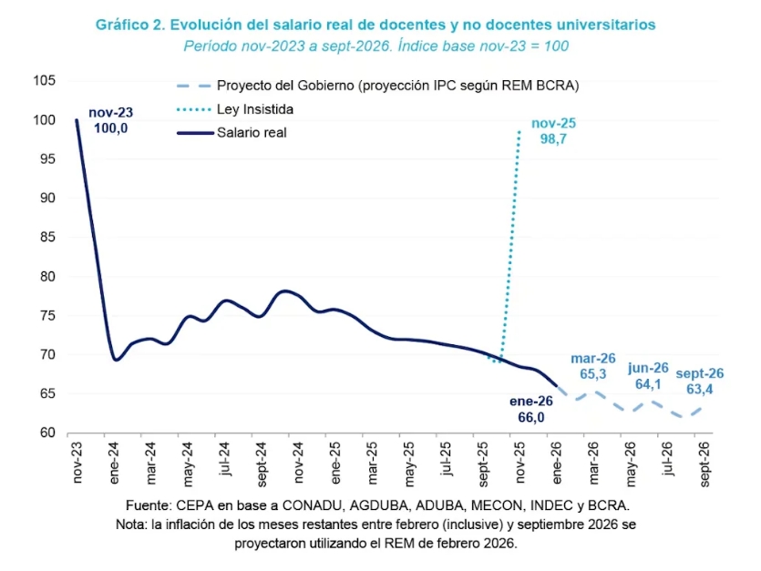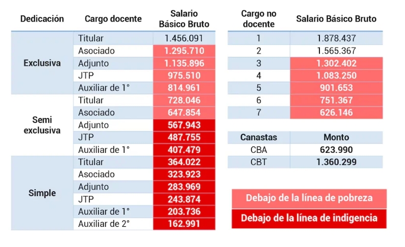 Uno de los puntos más sensibles es el salarial. Según datos difundidos por las universidades, los ingresos docentes perdieron 43,2% de poder adquisitivo desde la asunción de Milei, mientras que muchos profesores comenzaron a abandonar sus cargos por la imposibilidad de sostenerse con sus haberes.