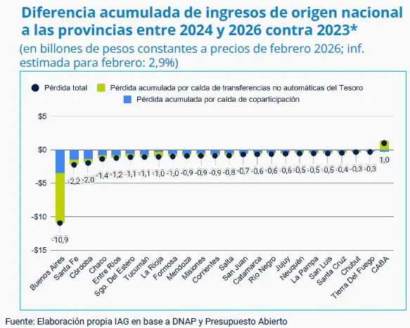 En concreto, a comienzos de este año las provincias ya habían acumulado una pérdida de $15,3 billones (a precios de febrero2026) respecto al nivel de recursos nacionales de 2023. "Producto de la caída de la recaudación de los últimos dos años, cayeron los recursos tributarios de origen nacional (los recursos coparticipados) que reciben las provincias, pero también cayeron las transferencias no automáticas que hace el Gobierno", señaló un documento del Instituto Argentina Grande (IAG).