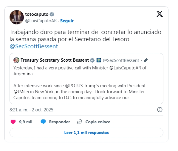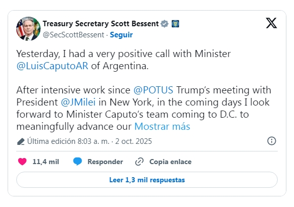 Temprano el pasado jueves, el funcionario norteamericano aseguró haber mantenido "una llamada muy positiva con el ministro Luis Caputo". y adelantó que esperaba "con ansias" la llegada del equipo argentino a Washington para avanzar en las discusiones sobre "las opciones para brindar apoyo financiero".