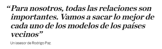 Un importante asesor del nuevo presidente dijo a LPO que la relación de Paz no será de alineamiento automático sino que buscarán un vinculo pragmático. "Para nosotros, todas las relaciones son importantes. Vamos a sacar lo mejor de cada uno de los modelos de los países vecinos", detalló de manera genérica. Un ejemplo de eso es la reivindicaron del modelo tributario paraguayo que hizo el vicepresidente Lara.