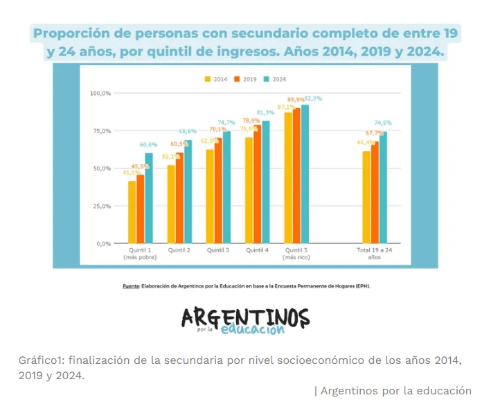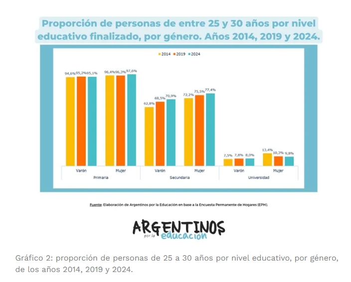 El estudio relevó las tasas de finalización de los niveles primario, secundario y universitario en los jóvenes argentinos de entre 25 y 30 años en tres momentos: 2014, 2019 y 2024. Allí se vio que la proporción de jóvenes que completó la escuela media pasó del 67,6% en 2014 al 74,2% en 2024. El dato muestra una mejora, pero también revela que uno de cada cuatro argentinos de entre 25 y 30 años todavía no tiene el título.