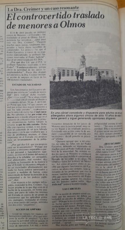 Algo similar acaba de contar en el diario La Nación el abogado Enrique Basla, artículo que también aquí recomiendo (https://www.lanacion.com.ar/opinion/infancia-castigo-y-ausencia-nid12022026) y del que surge la proeza de la abogada y poeta Matilde K. de Creimer quien, en plena dictadura, se atrevió a interponer amparos para visibilizar la psionalización de niños con adultos en la Cárcel de Olmos en 1982, producto del encierro masivo a consecuencia de redadas y razzias.
