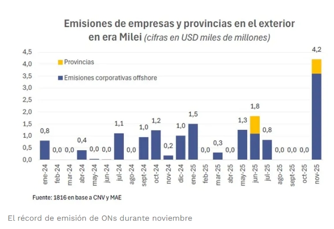 En el frente cambiario, el dólar mayorista se acercó a la banda superior se ubica a 4% del techo de la banda, pese a atravesar un período estacionalmente favorable por la mayor oferta de divisas. Uno de los factores clave detrás de este ingreso de dólares fue la fuerte emisión de Obligaciones Negociables (ONs), que ya marca un récord durante la gestión de Javier Milei. Según datos de la Consultora 1816, las emisiones superaron los u$s4.200 millones, sumando colocaciones provinciales y corporativas offshore.