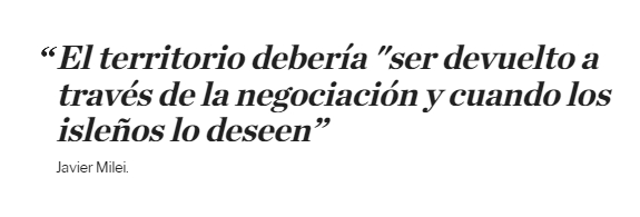 El artículo sostiene que Milei ató esta negociación va de la mano con la posición argentina sobre las Islas Malvinas y allí, el jefe de estado dijo que el territorio debería "ser devuelto a través de la negociación y cuando los isleños lo deseen".