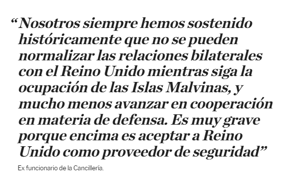 Un ex funcionario de la Cancillería dijo a LPO que "nosotros siempre hemos sostenido históricamente que no se pueden normalizar las relaciones bilaterales con el Reino Unido mientras siga la ocupación de las Islas Malvinas, y mucho menos avanzar en cooperación en materia de defensa. Es muy grave porque encima es aceptar a Reino Unido como proveedor de seguridad".