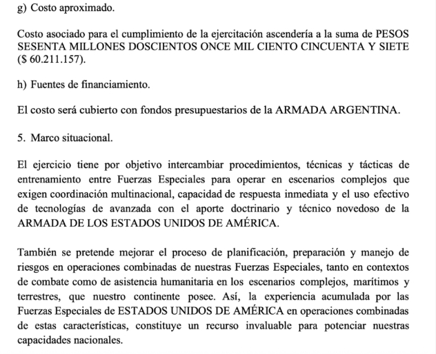 Según el documento oficial, la medida tiene como objetivo "intercambiar procedimientos, técnicas y tácticas de entrenamiento entre Fuerzas Especiales" para mejorar la coordinación multinacional, la capacidad de respuesta inmediata y el uso de tecnologías avanzadas. La Armada Argentina será la encargada de financiar la estadía de las tropas extranjeras, con un presupuesto estimado de $60.211.157.