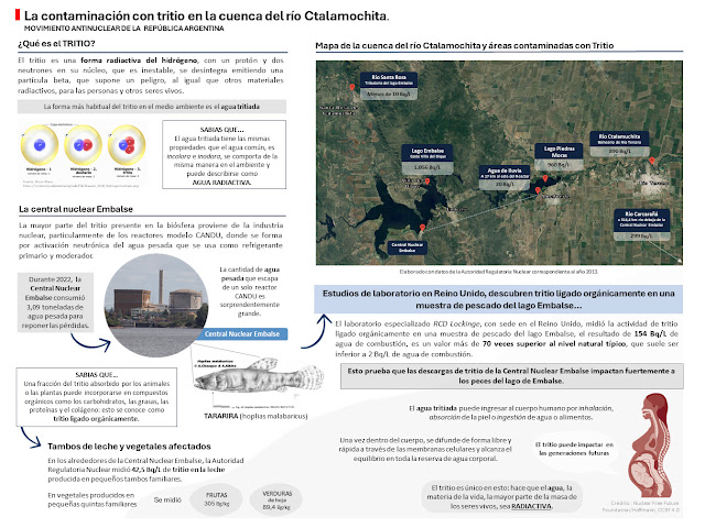 La cuenca del río Ctalamochita presenta las concentraciones de tritio más altas del mundo. Para dimensionar el problema, puede compararse la situación de Embalse con la de Fukushima. En la central nuclear japonesa accidentada, el límite anual de vertido de tritio es de 22 terabequerelios (TBq). Las emisiones líquidas de tritio de la Central Nuclear Embalse alcanzaron su pico histórico en 2013, con 553 TBq, unas 25 veces más que ese límite anual.