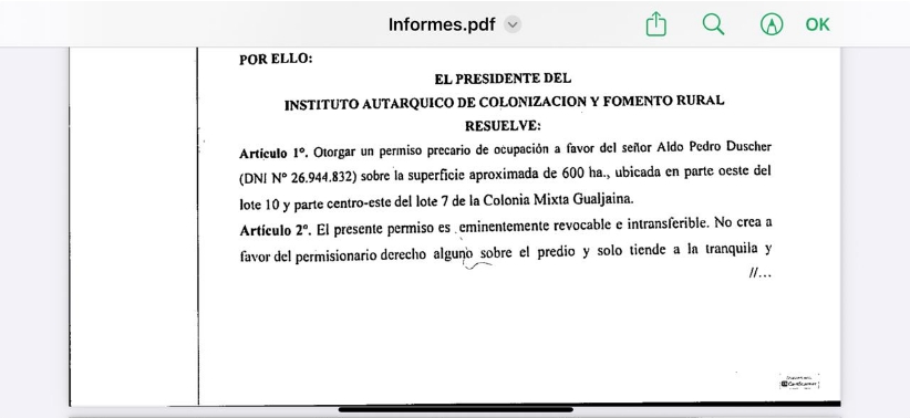 En diálogo con ANRed, el abogado Luis Virgilio Sánchez advirtió que se trata de una maniobra fraudulenta con complicidad estatal que involucraría a funcionarios del propio IAC. "Vamos a denunciar la compra y venta ilegal de tierras. Hoy la Oficina Judicial me envió la resolución del IAC: no le otorgan la tierra, le dan un permiso precario, y con eso voy a pedir el expediente completo", afirmó. Sánchez precisó que ese permiso puede caer si no se cumplen sus condiciones: "Debe haber ocupación efectiva y no puede haber animales de otras personas; por eso Duscher intentó comprar los animales de una mujer de la comunidad. Todo forma parte del plan: consolidar la ocupación para hacer los planos de mensura y luego obtener la adjudicación definitiva".
