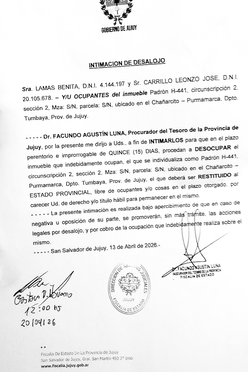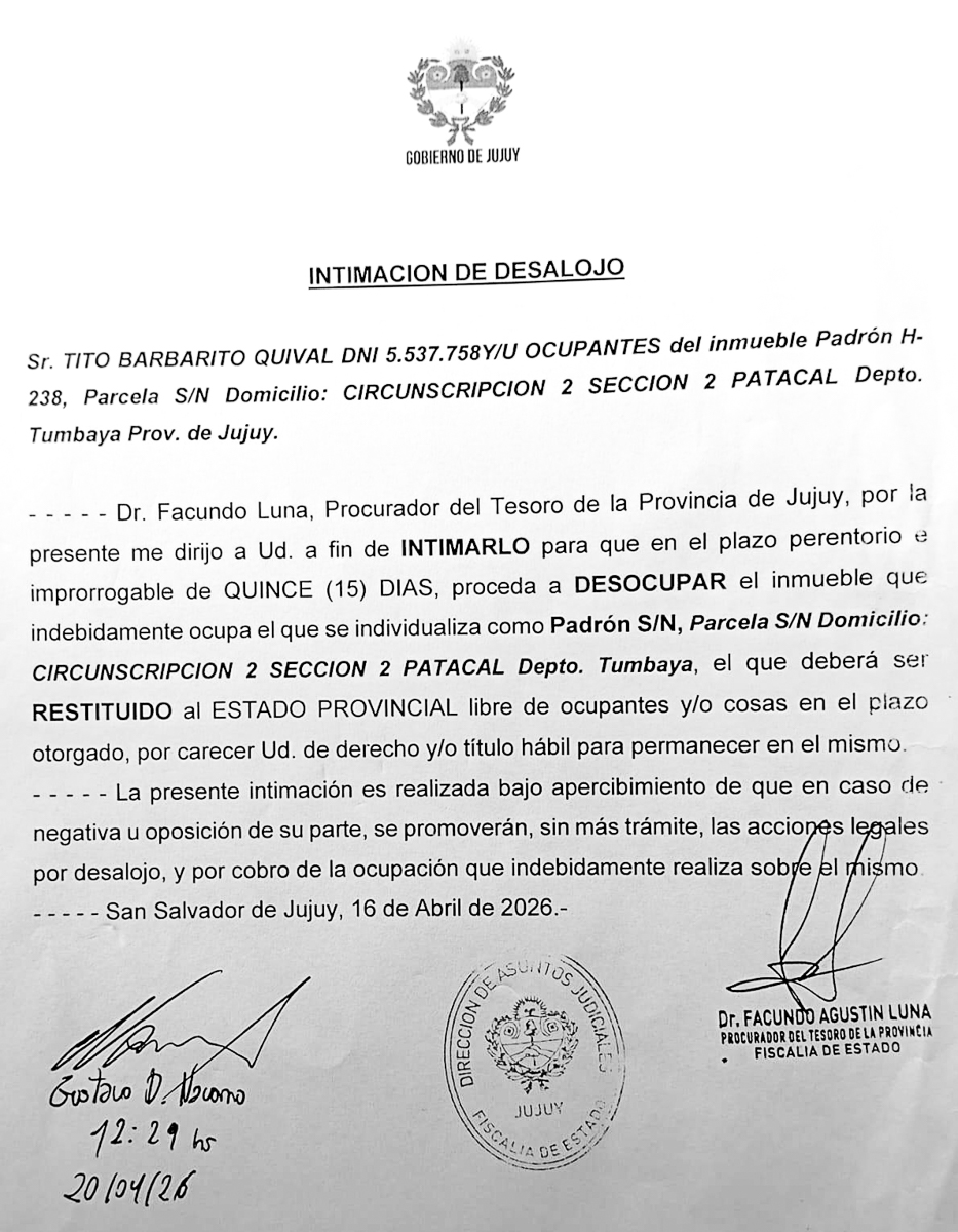 En las últimas horas, la Dirección de la Procuración del Tesoro de Jujuy, bajo la firma del Dr. Facundo Agustín Luna, emitió nuevas intimaciones de desalojo que afectan directamente a familias de las zonas de Chañarcito y Patacal, en el departamento de Tumbaya.