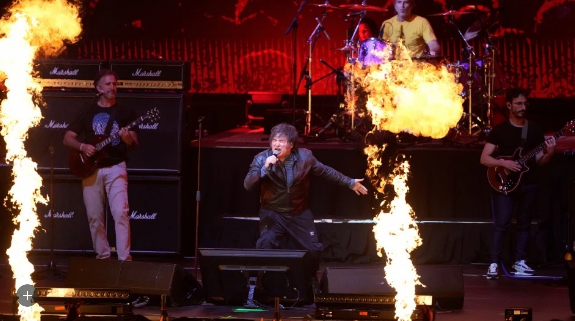 Milei se sacó el gusto de liderar un grupo de rock ante más de 10 mil personas en el Movistar Arena. La excusa fue la presentación de su libro El milagro argentino, publicado por Hojas del Sur.