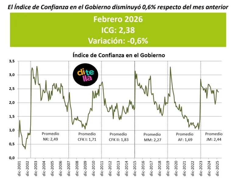 La confianza en la gestión de Javier Milei volvió a retroceder en febrero. Así lo reflejó el último informe de la Universidad Torcuato Di Tella, que ubicó el Índice de Confianza en el Gobierno (ICG) en 2,38 puntos sobre un máximo de 5.