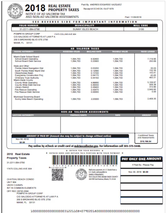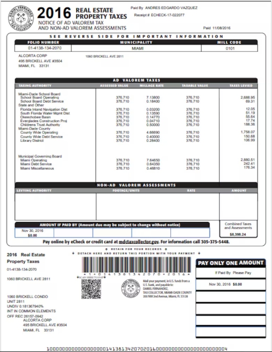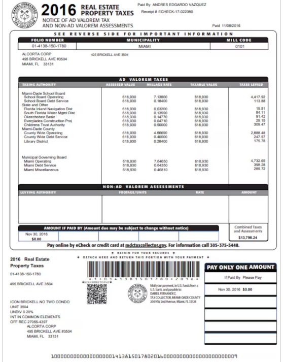 Según esa misma documentación, el segundo inmueble está tasado hoy en 419.200 dólares. Y el mismo día de 2014, 29 de noviembre, y con el mismo echeck que usó para pagar la propiedad anterior -el 15-070721-, "Andrés E. Vázquez" pagó 8077,24 dólares en concepto de "Real Estate Property Tax". Y también figuró por su nombre completo al abonar las obligaciones en 2015 y 2016, siempre con cheques electrónicos.