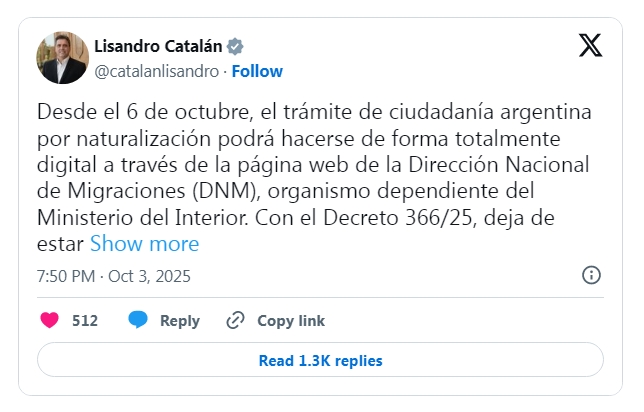 "Desde el 6 de octubre, el trámite de ciudadanía argentina por naturalización podrá hacerse de forma totalmente digital a través de la página web de la Dirección Nacional de Migraciones. La medida busca agilizar gestiones, garantizar mayor seguridad y transparencia, y simplificar el acceso para extranjeros mayores de 18 años con residencia en el país que deseen naturalizarse argentinos", celebró Catalán.