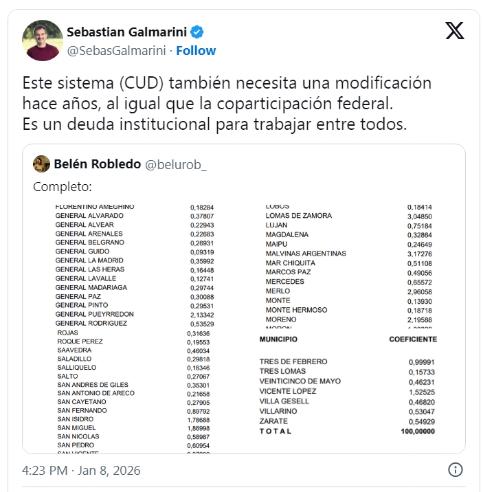 Las críticas no apuntan tanto al gobierno de Kicillof sino a un mecanismo que muchos consideran obsoleto. Por caso, el diputado nacional Sebastian Galmarini (Unión por la Patria) planteó que el sistema, al igual que la coparticipación federal, una modificación hace años. "Es un deuda institucional para trabajar entre todos", planteó.