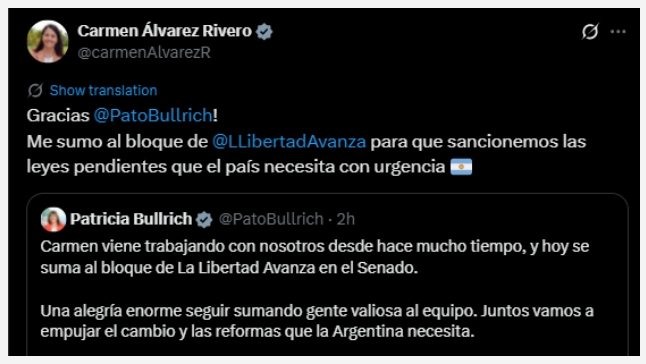 Como ya ocurrió en Diputados --donde varios bullrichistas cruzaron de vereda--, la ministra de Seguridad repite la maniobra en la Cámara Alta. "Una alegría enorme seguir sumando gente valiosa al equipo", escribió en X, en tono celebratorio.
