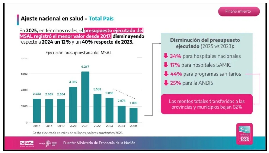 Entre 2023 y 2025, el presupuesto ejecutado del Ministerio de Salud se redujo en un 40%. Esto implicó recortes del 34% en hospitales nacionales, del 17% en centros de salud que se administran en conjunto con las provincias, del 44% en programas sanitarios y del 25% para la Agencia Nacional de Discapacidad (Andis), disuelta a fin del año pasado, en medio del escándalo por el posible pago de coimas.