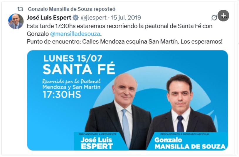 No es el único dirigente del partido de Alsogaray que aparece en la nómina. El rosarino Gonzalo Mansilla de Souza fue candidato de Espert en Santa Fe y el 15 de julio de 2019 viajó desde San Fernando en un avión de Machado. Ese día Espert y Mansilla participaron de una caminata de campaña por la peatonal de la capital provincial que arrancó en la esquina de Mendoza y San Martín.