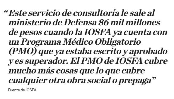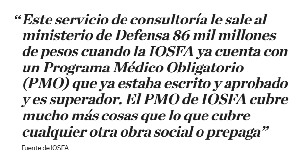 Una fuente que sigue de cerca todo el proceso de la obra social de los militares detalló a LPO que "este servicio de consultoría le sale al ministerio de Defensa 86 mil millones de pesos cuando la IOSFA ya cuenta con un Programa Médico Obligatorio (PMO) que ya estaba escrito y aprobado y es superador. El PMO de IOSFA cubre mucho más cosas que lo que cubre cualquier otra obra social o prepaga".