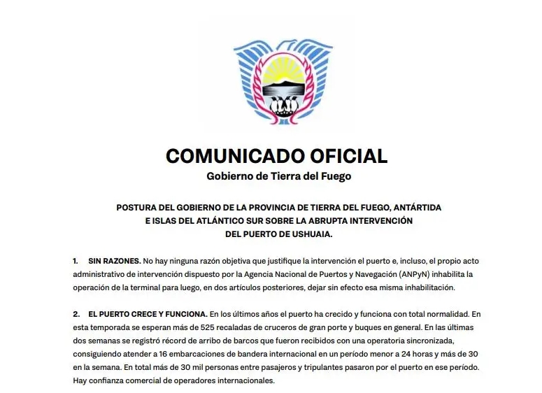 "Se desconocen las razones e intenciones del Gobierno Nacional para avanzar en esta intervención. Se están instalando narrativas preocupantes respecto a intencionalidades geopolíticas o económicas -no explicitadas- que trascienden la realidad del puerto y que parecieran estar detrás de una medida de esta magnitud", denunciaron, a través de un comunicado, las autoridades de la provincia gobernada por Gustavo Melella.