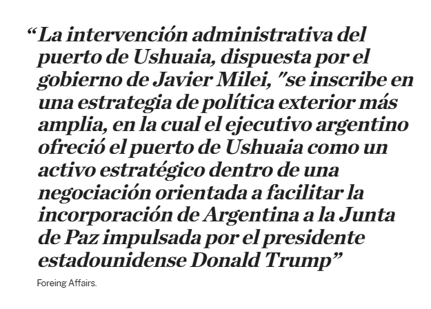 Ahora, Foreign Affairs Latinoamérica publicó un revelador artículo en el que plantea que tanto este misterioso barrio como la intervención administrativa del puerto de Ushuaia, dispuesta por el gobierno de Javier Milei, "se inscribe en una estrategia de política exterior más amplia, en la cual el ejecutivo argentino ofreció el puerto de Ushuaia como un activo estratégico dentro de una negociación orientada a facilitar la incorporación de Argentina a la Junta de Paz impulsada por el presidente estadounidense Donald Trump, iniciativa presentada en enero de 2026 durante el Foro Económico Mundial en Davos".