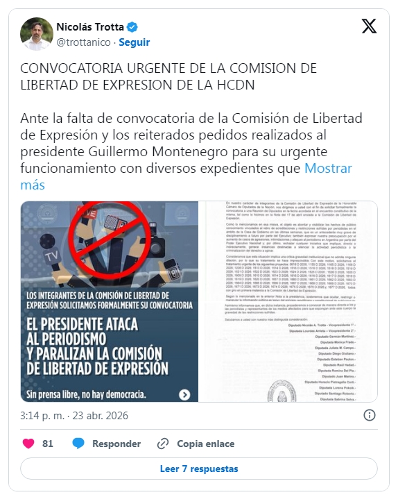 El pedido había sido elevado por la mañana al titular de la comisión de Libertad de Expresión, Guillermo Montenegro (LLA), aunque hasta el momento no hubo definiciones sobre la suspensión de las acreditaciones: no se convocó a la comisión ni se registraron pronunciamientos públicos al respecto. En sus redes sociales, en cambio, el legislador compartió un posteo de la ministra Sandra Pettovello sobre el "descenso de la pobreza infantil".
