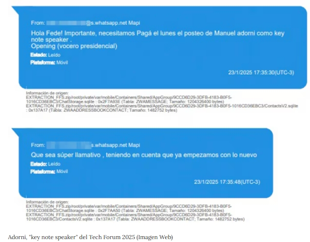 En ese grupo, bautizado como "Marketing & Web Tech Forum 2025" se planificaban flyers, posteos y carpetas digitales para vender el evento. En ese marco, hasta se analizaron dos versiones de la cara de Adorni para ver cuál quedaba mejor. Como mostró el periodista, docente y programador Maximiliano Firtman, el 27 de enero la cuenta de Tech Forum compartía un aviso en inglés que decía que les complacía anunciar que el entonces portavoz presidencial daría apertura al encuentro (Tech Forum LATAM 2025) el día 5 de abril del año pasado. El entonces vocero no lo desmintió en el momento de la publicación; recién lo hizo luego de que estallara el escándalo de $LIBRA.