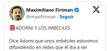 Con la mejor cara de piedra, Adorni mintió en la primera entrevista que dio a un canal de televisión tras el escándalo LIBRA e intentó desmarcarse, tal como lo hizo este miércoles, atacando a la prensa. "Todo lo que puedan decir es falso", dijo Adorni el 20 de febrero de 2025, seis días después del revuelo por la criptomoneda. "Hasta han divulgado que yo había organizado todos los encuentros y que yo además iba a participar del próximo Tech Forum. Dicen cualquier cosa, son tan imbéciles que ni siquiera me ocupo de salir a desmentir las cosas excepto que me las pregunten", abundó. Lo cierto es que estaba anunciado, que los chats lo acreditan y que Firtaman volvió a compartir las imágenes.
