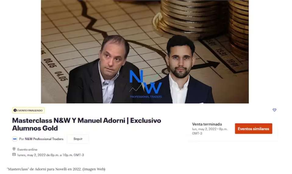 La invitación de Novelli decía a sus alumnos que "como beneficio por ser alumno Gold, podrás participar de un excelente Masterclass junto con el famoso columnista argentino Manuel Adorni y N&W Professional Traders". "En esta ocasión, hablaremos sobre la libertad financiera. Y además, por qué el mundo de las finanzas digitales cambiarán el mundo". Aunque parezca increíble, hubo varios jóvenes aspirantes a criptobró que pagaron el servicio.