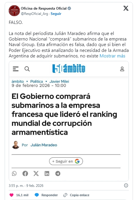 Recientemente, mediante la cuenta de X "Oficina de Respuesta Oficial", administrada por Juan Pablo Carreira, el Gobierno indicó que el artículo titulado "El Gobierno comprará submarinos a la empresa francesa que lideró el ranking mundial de corrupción armamentística" era falso.