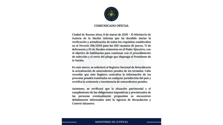 El ministro de Justicia de la Nación, Juan Bautista Mahiques, anunció este domingo el inicio del proceso formal para cubrir vacantes en el sistema judicial federal, tras asumir recientemente el cargo en reemplazo de Mariano Cúneo Libarona. La medida apunta al nombramiento para 337 cargos distribuidos en 200 jueces, 72 defensores oficiales y 65 fiscales, con el objetivo de reactivar los procedimientos previstos en el Decreto 588/2003 y avanzar luego con el envío de los pliegos al Senado.