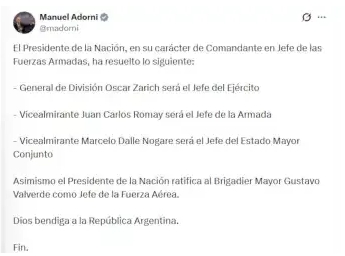 En su tuit, Adorni especifica: "El Presidente de la Nación, en su carácter de Comandante en Jefe de las Fuerzas Armadas, ha resuelto lo siguiente: