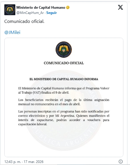 El Ministerio de Capital Humano anunció que dará de baja casi 900 mil planes sociales del programa Volver al Trabajo (VAT), que había reemplazado al Potenciar Trabajo. Actualmente pagaba $78.000 por mes. Según confirmó la cartera que conduce Sandra Pettovello a través en un comunicado, finalizará el 9 de abril y será reemplazado por un sistema de vouchers.