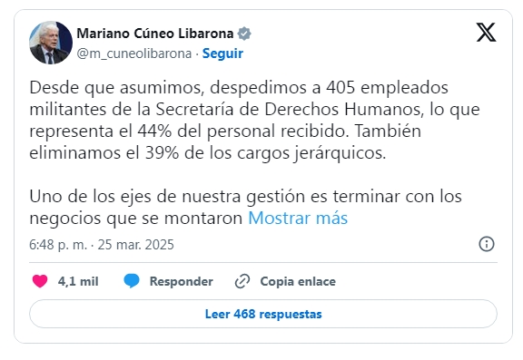 El nombramiento tuvo lugar días después de que el ministro de Justicia Mariano Cúneo Libarona se jactara en X de haber despedido 405 trabajadores de la SDH y de haber reducido en un 39 por ciento los cargos jerárquicos.