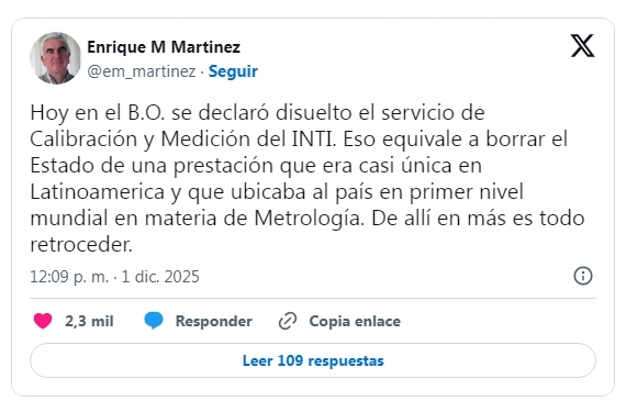 La reacción fue inmediata en el sistema científico y productivo. Enrique Martínez, expresidente del INTI, advirtió que la decisión borra al Estado de una prestación única en Latinoamérica y que lo que se presenta como eficiencia es, en realidad, un paso atrás para la industria y la ciencia aplicada.