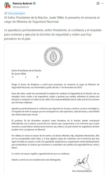 La renuncia fue informada también a través de X (@PatoBullrich). Allí publicó un mensaje acompañado del documento oficial: "Al Señor Presidente de la Nación, Javier Milei, le presento mi renuncia al cargo de Ministra de Seguridad Nacional. Le agradezco profundamente la confianza y el respaldo para sostener y ejecutar la doctrina de seguridad y orden que hoy prevalece en el país".