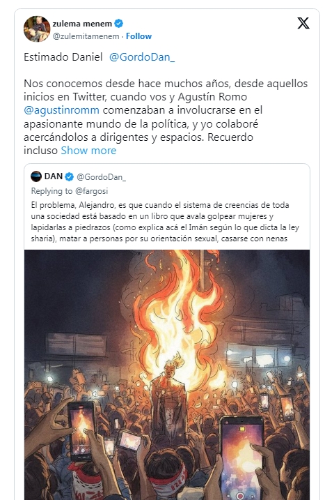Zulemita Menem salió a cruzar al Gordo Dan luego de su ataque al Islam. Los riojanos le hicieron borrar un tuit a Fargosi.