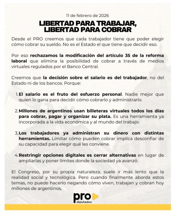 Otro de los puntos que el PRO intentará reincorporar es la posibilidad de que los trabajadores elijan cobrar su salario a través de billeteras virtuales, una opción que figuraba en el proyecto original y fue eliminada en el Senado. Para Ritondo, se trata de una cuestión de libertad de elección y de adecuar la legislación a las prácticas actuales.