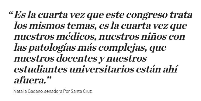 La jornada transcurrió sin la tensión habitual porque el resultado de las votaciones estaba cantado. La santacruceña Natalia Gadano puso de manifiesto el tedio cuando dijo que "es la cuarta vez que este congreso trata los mismos temas, es la cuarta vez que nuestros médicos, nuestros niños con las patologías más complejas, que nuestros docentes y nuestros estudiantes universitarios están ahí afuera".