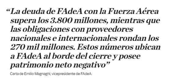 En esa carta dijo que la deudacon la Fuerza Aérea supera los 3.800 millones, mientras que las obligaciones con proveedores nacionales e internacionales rondan los 270 mil millones. Estos números ubican a FAdeA al borde del cierre: posee "patrimonio neto negativo" y una "liquidez operativa prácticamente nula", denunció el vicepresidente.