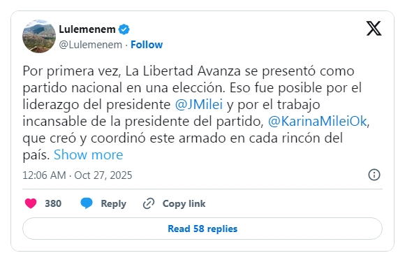 "Lule va a empujar ahora a fondo antes que baje la espuma, van a tratar de convencerla a Karina para caerles con todo a Milei", afirmó a LPO un legislador libertario que los conoce de cerca. De hecho, el segundo de Karina Milei en la Secretaría General de la Presidencia tuiteó este lunes, arrogándose el éxito electoral.