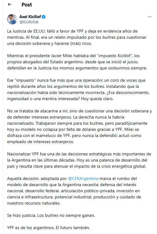 También Macrì y Fernández reclamaron plácemes por su desempeño durante el largo proceso judicial y se los restaron a Milei. La verdad es que cada uno a su manera, cada cual hizo su aporte para llegar a este resultado, en un terreno judicial que es tan o más hostil que Comodoro Py. Pero el mérito de esos gobiernos ha sido el de sus equipos legales. Como bien dijo el actual ministro Luis Caputo, abogados que ganan mil dólares por mes vencieron a los estudios más poderosos del mundo, si bien CFK recordó, y encomió, el rol del estudio neoyorkino Sullivan & Crownwell. Pero antes de obtener la presidencia, Macrì dijo que había que cumplir el fallo del juez Griesa en favor de Paul Singer y sus buitres, y Milei dos años antes de ser electo Presidente maldijo "la confiscación ilegal de YPF". La iniciativa de la expropiación la tomó Cristina. Néstor Kirchner estudió esa posibilidad pero concluyó que por entonces el país carecía de los recursos suficientes para hacerlo y se contentó con cancelar la deuda con el FMI como primer paso. Desde el Ministerio de Economía, Amado Boudou advirtió sobre la vertical disminución de las reservas apurada por Repsol y la reversión del balance energético que pasó a ser negativo por primera vez desde la privatización, y Kicillof ejecutó la expropiación luego de que Barack Obama le informara a Cristina que los estudios satelitales realizados por su país indicaban que en Vaca Muerta estaba una de las dos o tres mayores reservas de petróleo y de gas no convencional del mundo. Desde entonces el kirchnerismo supo que le tocaba la parte árida porque convertir ese tesoro en reservas explotables llevaría más años que los que le quedaban de gobierno, y que otro lo disfrutaría. Pese a lo cual la emprendió con el mayor esfuerzo. En cambio Milei, aún después del fallo, que festejó como un éxito propio, sentenció que "expropiar está mal porque robar está mal". Este pobre hombre tiene un corso a contramano. Si se lo toma al pie de la letra festeja la impunidad de un robo, cuyo producto disfruta.