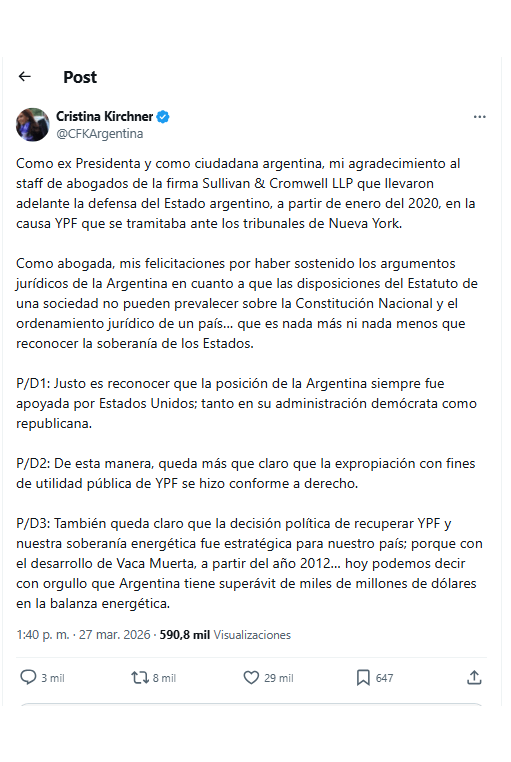 En forma concisa, la ex Presidenta CFK explicó la importancia del fallo. Luego de felicitar al estudio de abogados de Nueva York que sostuvo los argumentos jurídicos de la Argentina: que el Estatuto de una sociedad no puede prevalecer sobre la Constitución Nacional y el ordenamiento jurídico de un país… "que es nada más ni nada menos que reconocer la soberanía de los Estados". Recordó que siempre contó con el apoyo de Estados Unidos, tanto de los demócratas cuanto de los republicanos. Esa expropiación de YPF conforme a derecho fue una decisión política estratégica, ya que con el desarrollo de Vaca Muerta, a partir del año 2012,"la Argentina tiene superávit de miles de millones de dólares en la balanza energética".