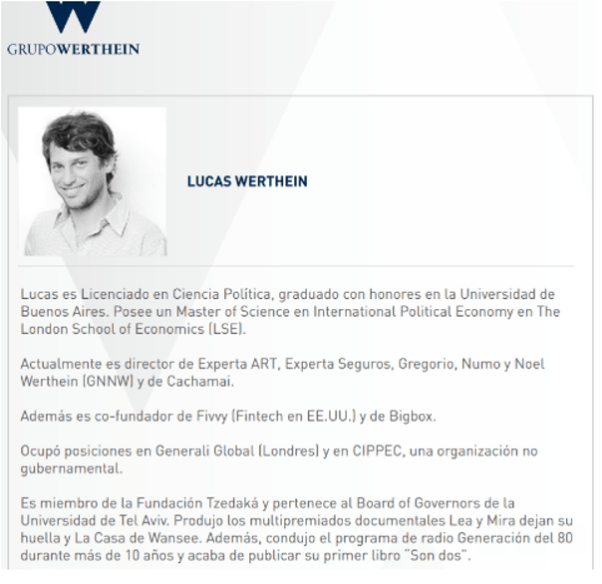 El apoyo de la Zarina a Manuel Adorni tiene motivos políticos, pero también corporativos, que involucran al Grupo Werthein. Directivo de Torneos, Sociedad de Responsabilidad Limitada, inscripta en el estado de Florida, en Estados Unidos, Grandío es cuñado de Santiago Nofal, quien tiene como socio a Marcelo Rubén Wegbrait, socio a su vez de Lucas Werthein en la Sociedad anónima S.M.L. S.A..
