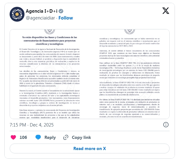 A través de la Agencia Nacional de Promoción de la Investigación -Agencia I+D+i- se sostenía el grueso del financiamiento científico a través de estos créditos que son de afectación específica y los otorgó el BID, el BCIE o CAF. Luego de dar de baja los proyectos en curso del 2022 y la convocatoria del año siguiente, ahora el gobierno tuvo que apurar un nuevo llamado de proyectos a partir del 2 de enero pero por un pozo de un millón cien mil dólares para el financiamiento (ver abajo).