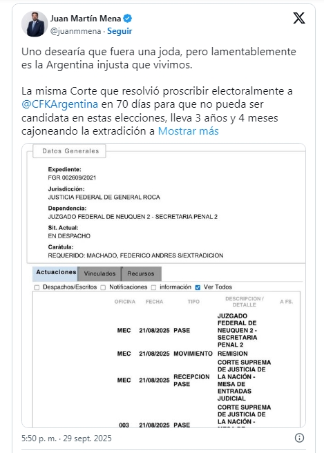 Por si fuera poco, Cristina, en el mensaje a candidatos de Primero la Patria, afirmó que "estamos compañeros, compañeras, en la Argentina, con una Corte Suprema brindando protección a un narcotraficante". Y planteó la pregunta de qué hubiera ocurrido si en vez de Espert, el apuntado por vínculos con el narco Machado fuera un candidato del PJ. "¿Alguien imagina si esto hubiera pasado con algún candidato del peronismo o del kirchnerismo, como más te guste?", dijo y volvió a abrir un interrogante retórico: "¿Puede un país encarar un proyecto de desarrollo y crecimiento económico con este Poder Judicial, que en lugar de hacer justicia se dedica a hacer política y de la peor?".