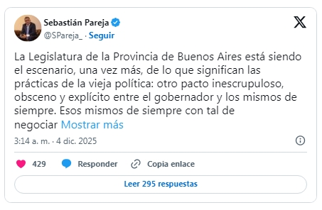 "Tomen nota. Usan al Directorio del Banco Provincia como botín de guerra, pervirtiendo la entidad financiera aún cuando ya juraron los nuevos legisladores. Se aprovechan de las últimas horas de los mandatos vigentes para hacer NEGOCIOS que saben que se van a terminar cuando asuma la nueva bancada de La Libertad Avanza", lanzó Pareja.