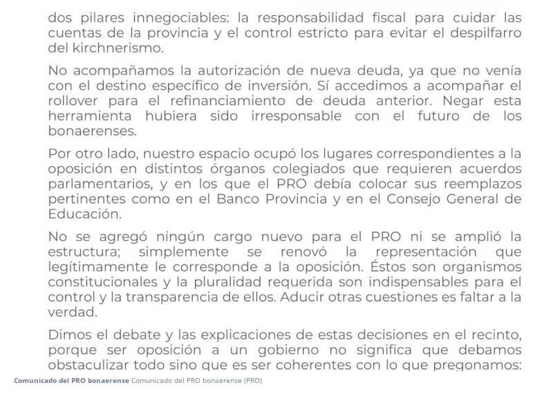 Desde el bloque del PRO le contestaron en un comunicado seco y sin chicanas: "Negar esa herramienta hubiera sido irresponsable con el futuro de los bonaerenses". Sobre los lugares en el BaPro, advirtieron: "Nuestro espacio ocupó los lugares correspondientes a la oposición. No se agregó ningún lugar nuevo para el PRO".