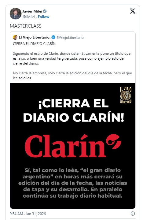 Un día después de la nota de Clarín, Milei publicó un par de tuits furiosos contra el diario. "Masterclass" puso en un tuit en el que citaba otro que, de manera irónica, hablaba del cierre del Clarín. La explicación del "chiste" era que el diario cerraba como cada noche antes de imprimir su edición del día siguiente.