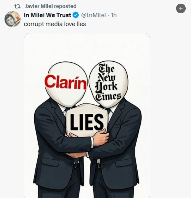 Luego Milei retuiteó a otro usuario que dijo que "Clarín sin pauta miente", junto a una enumeración de conceptos sobre el rol de los medios.